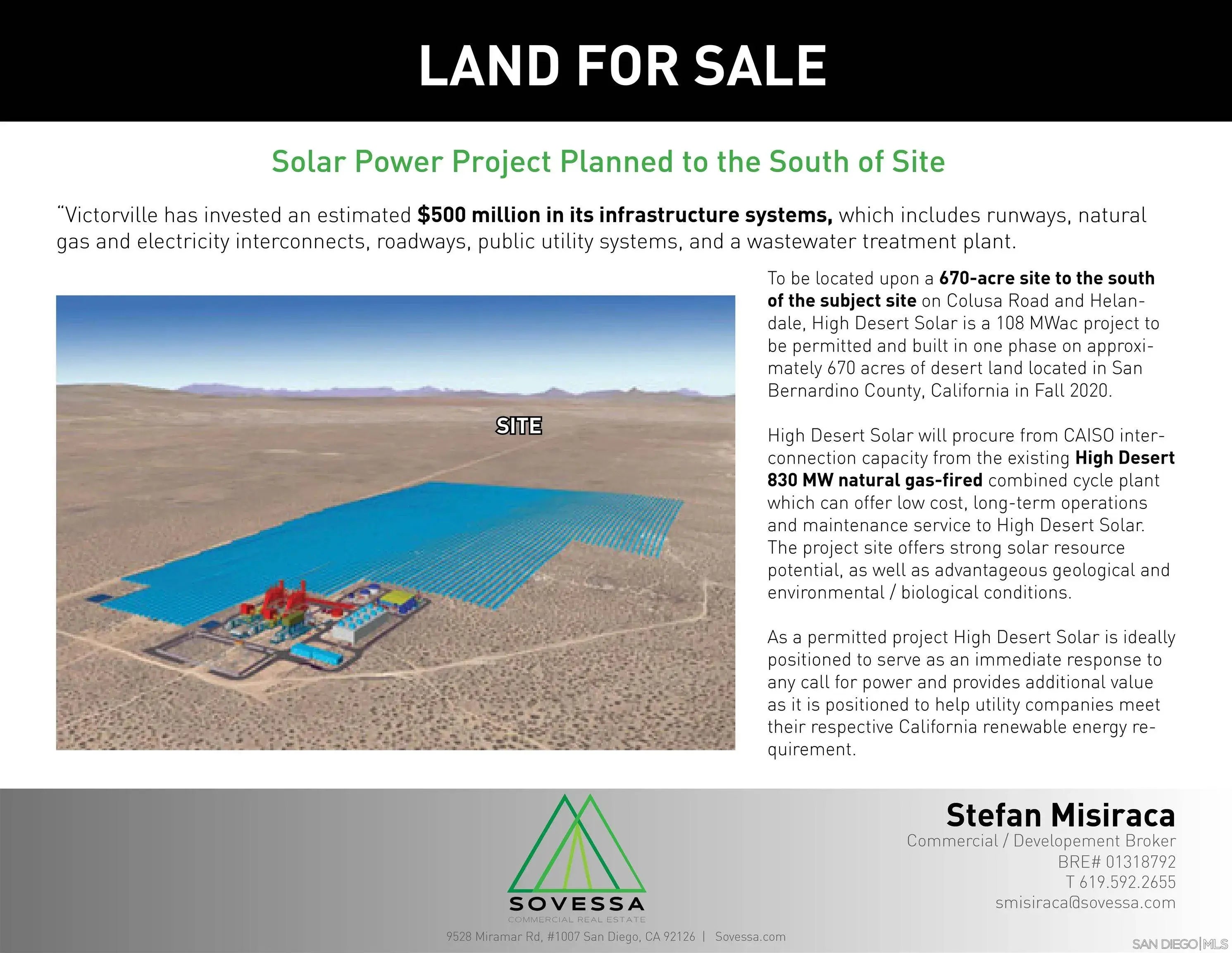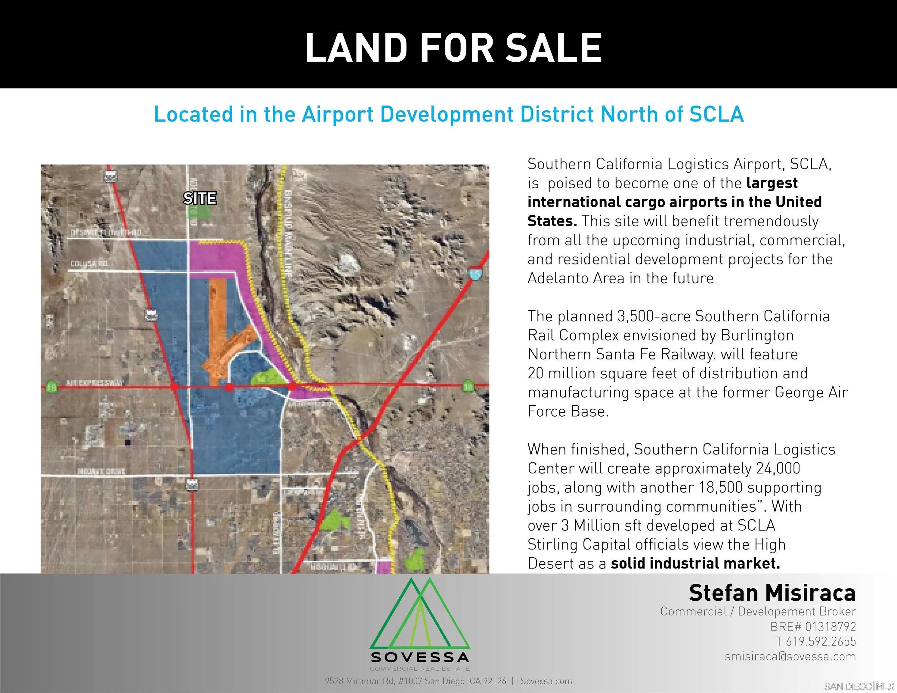 160 Acres of commercial land. This site located in the path of growth 2 miles to the north of SCLA and has several factors making this a desirable strategic asset that will appreciate well into the future. Goldman Sachs Renewable Power has acquired 670 acres for a 100MW solar PV plant with a 50MW battery storage facility currently under operation. The property is in the County of San Bernardino near the city of Adelanto ADD Airport Development District, allowing for a wide range of non-residential uses, generally encompassing light and heavy industrial, retail, office and other commercial uses that are oriented around airport operation, services, industries, and businesses.