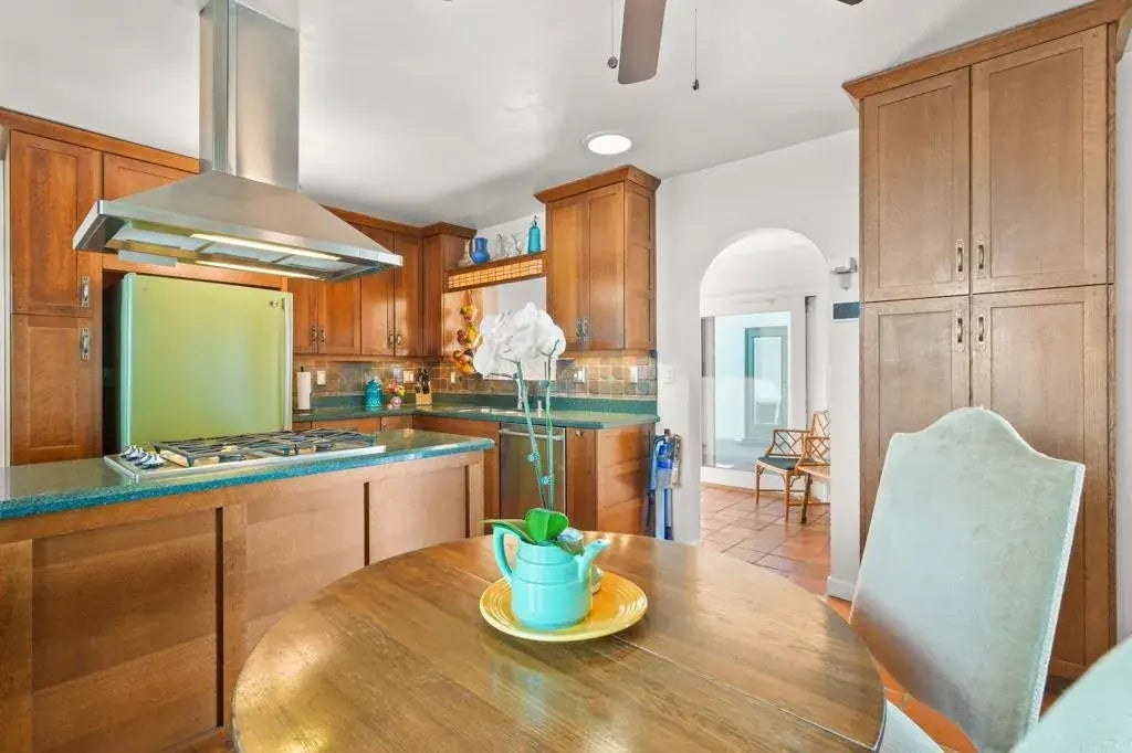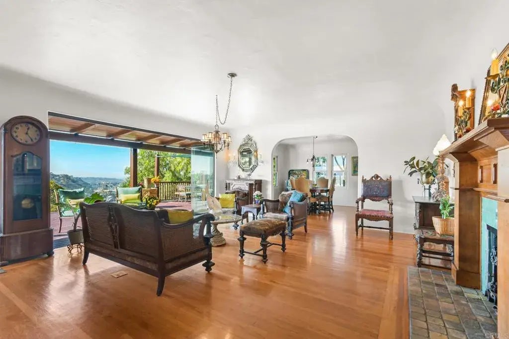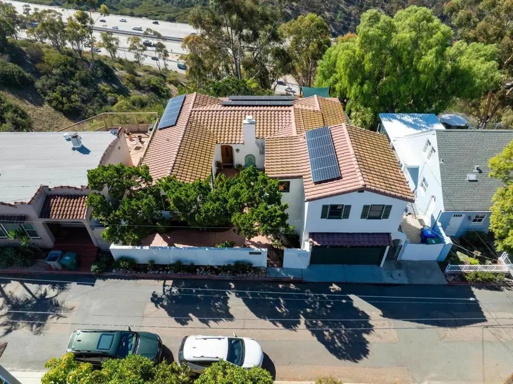 Perched on a canyon north of Adams in the Normal Heights neighborhood, this beautiful Spanish-style makes for an entertainer's paradise and a cozy place where sunsets over the canyon become part of your daily rhythm. The stunning views, expansive deck, and cozy secluded feel, this property offers both a space designed to entertain and tranquil place to call home. The custom iron gate at the entry to the courtyard is the first glimpse at the craftsmanship youll experience throughout. Pops of color and sounds of flowing water in the courtyard are a welcome greeting to all who make their way through to the front door. Upon entering you will begin to see the views, through the glass panel wall, which make this home so special. With the glass panel wall open, youll experience a seamless indoor-outdoor living space. The deck spans the width of the home and features a glass panel railing that keeps the views of the valley and ocean unobstructed. At the south end of the deck, an inset hot tub invites you to relax and enjoy the green valley view. At the north end, a pergola covered dining area framed by an updated wooden railing offers another space to entertain. With its functional gas fireplace, original built-ins, and thoughtful updates throughout, this home offers both comfort and charm. Inside, the Craftsman-style kitchen features upgraded appliances, including a Dacor range and Bosch dishwasher, complementing the homes warm architectural details. The upstairs primary suite offers a private ensuite bath, ample closet space, and western views from the window. One of the bedrooms
