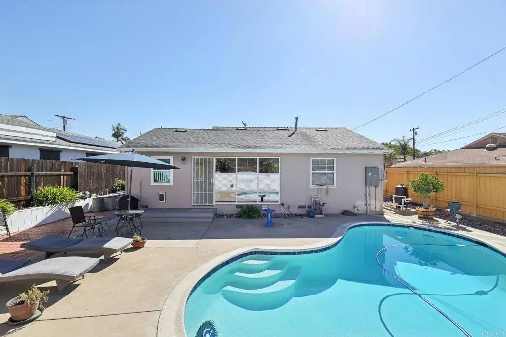 Stunning 2-Bedroom Oasis in La Mesa 6642 Eldridge St, San Diego, CA 92120 Discover your dream home in the heart of beautiful Allied Gardens! This meticulously upgraded 2-bedroom, 1-bathroom single-family residence offers modern comfort, energy efficiency, and resort-style living with a sparkling private pool and full professional landscaping that creates a serene, low-maintenance outdoor paradise. Key Features & Recent Upgrades: New Roof (2019) Peace of mind with a durable, high-quality installation. Paid-Off Solar System (15 Panels) Enjoy minimal electric bills and eco-friendly living; fully owned with no leases or payments. Pool Perfection: Freshly replastered with new tiles (2021), plus a brand-new filtration system installed in 2025 for crystal-clear water year-round. Fresh Exterior Paint (2023) Curb appeal that shines with a modern, updated look. Energy-Efficient Double-Pane, Fire-Resistant Windows (2024) Enhanced insulation, noise reduction, and safety. New Electrical Panel (2024) Up-to-code and ready for all your modern needs. Entire Home Replumbed (2025) Complete copper repiping for reliability and efficiency. Nestled in a quiet, desirable San Diego neighborhood (92120 ZIP), this home combines timeless charm with cutting-edge upgradesperfect for first-time buyers, downsizers, or anyone seeking turnkey luxury. The open layout flows seamlessly to the poolside patio, ideal for entertaining or relaxing in the California sun. Full landscaping includes lush greenery, automated irrigation, and easy-care design. Priced to sell and move-in readyno projects needed! Sch